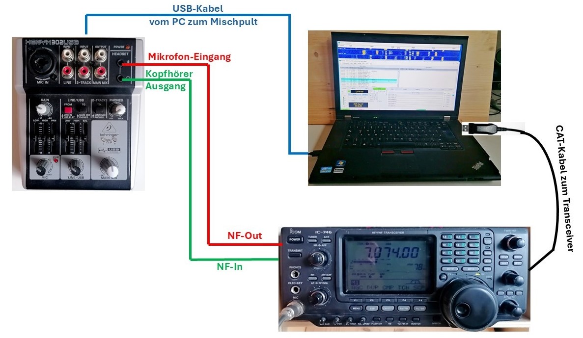 Das nachfolgende Schaubild zeigt den Musteraufbau mit einem IC-746 von Icom und dem Behringer Xenyx 302 USB.