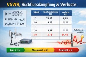 VSWR (Voltage Standing Wave Ratio) beschreibt die Anpassung zwischen einer Hochfrequenzquelle (z. B. Sender) und der Last (z. B. Antenne). Eine schlechte Anpassung führt zu reflektierter Leistung, die nicht in die Last gelangt, und erhöht damit die Verluste im System. VSWR ist daher ein zentrales Maß für die Effizienz von Funkverbindungen.Ein VSWR von 1,0 bedeutet eine perfekte …